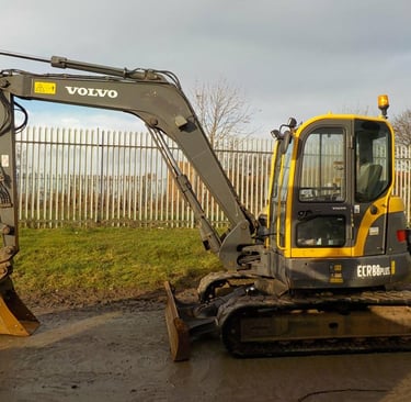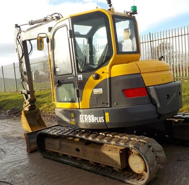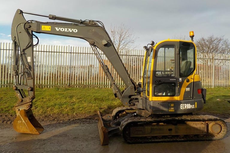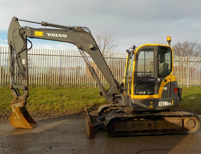 Escavatore midi Volvo ECR88 del 2011, cingoli in gomma, lama, offset, CV, tubazioni ausiliarie, attacco rapido idraulico, aria condizionata in cabina, motore Volvo modello D3.4, 4 cilindri, potenza motore: 43,8 kW / 59 CV, sistema idraulico Load Sensing a centro chiuso per una totale indipendenza dei movimenti. Comandi idraulici servocomandati, profondità di scavo: 4,87 mt, larghezza cingoli: 450 mm, lunghezza macchina: 6,41 mt, larghezza macchina: 2,30 mt, altezza macchina: 2,68 mt, sistema di lubrificazione automatica, funzionamento martello idraulico, peso operativo: 9150 Kg, certificazione C.E., garanzia.