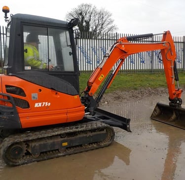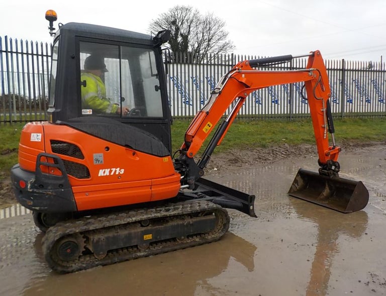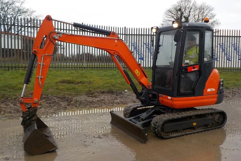 Miniescavatore Kubota KX71-3 del 2015, cingoli in gomma, lama, offset, CV, tubazioni ausiliarie, attacco rapido idraulico, aria condizionata in cabina, motore Kubota modello V1505-E2-BH-10EU, potenza motore: 20,5 kW / 88 CV, il potente e affidabile motore Kubota fornisce una potenza economica ed ecologica. L'efficienza del motore è così efficiente che un serbatoio di carburante gli consente di lavorare per più di 10 ore. Capacità benna: 0,07 mc, profondità di scavo: 2,68 mt, larghezza cingoli: 300 mm, lunghezza macchina: 3,320 mt, larghezza macchina: 1,5 mt, altezza macchina: 2,410 mt, sistema di lubrificazione automatica, funzionamento martello idraulico, certificazione C.E. Garanzia del rivenditore - 12 mesi..